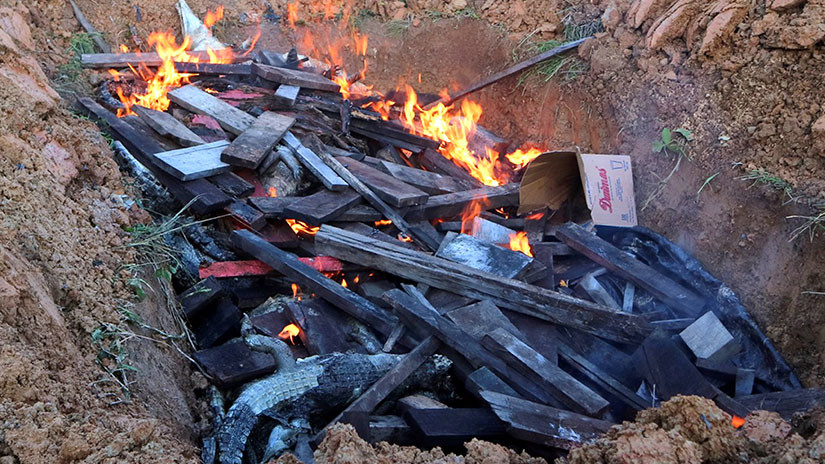 Los cuerpos de los animales, matados brutalmente con el uso de cuchillos y palos afilados, fueron introducidos en un hoyo donde los colocaron junto a leña.