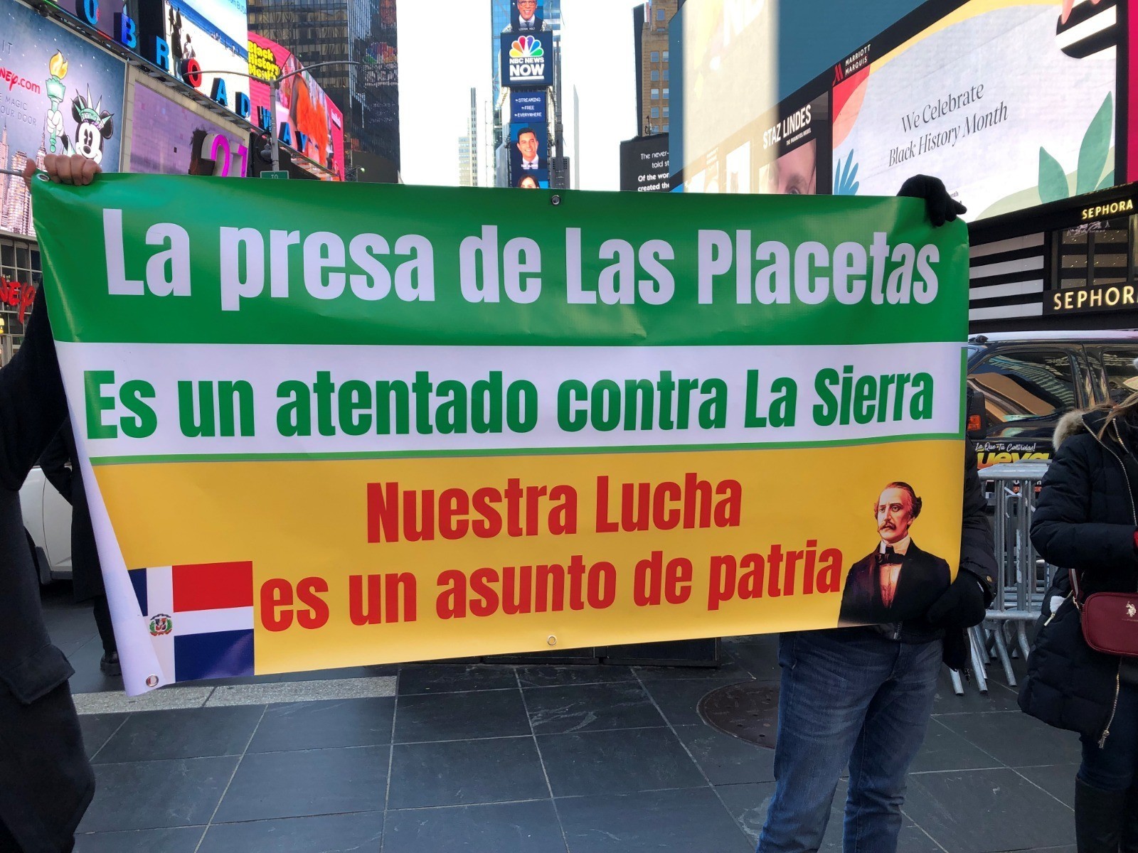 New York.-Serranos de la Cordillera Central residentes en Nueva York, que se oponen a la construcción de la presa de Las Placetas realizaron un piquete en Times Square la popular plaza turística de Manhattan, donde el Consulado Dominicano izó por primera vez la Bandera Dominicana en ese lugar con motivo del 178 aniversario de la Independencia Nacional.
