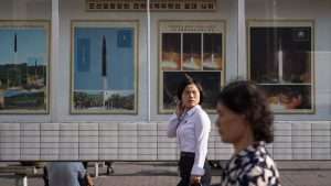 Dos personas pasan frente a imágenes que muestran lanzamientos de misiles de Corea del Norte en una exhibición en Pionyang, el 22 de septiembre de 2017. / Ed JONES / AFP