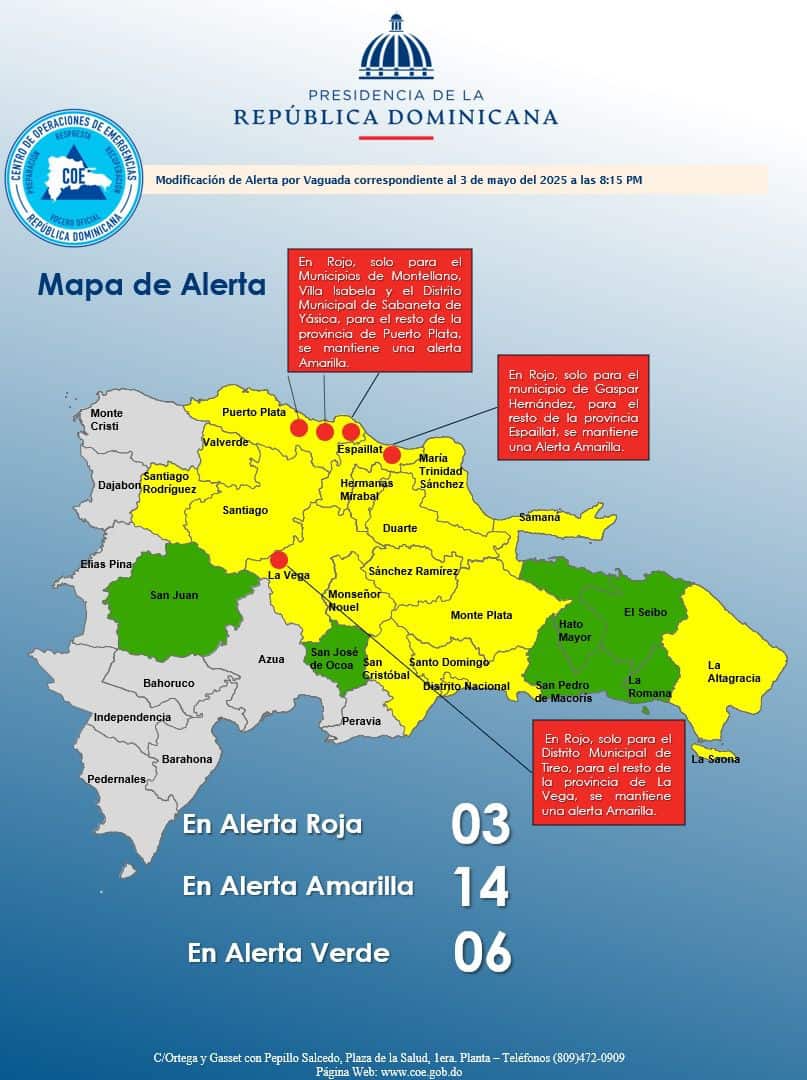 Por otro lado, seis provincias se mantienen en alerta verde, un nivel que implica condiciones de vigilancia preventiva. La Romana, San José de Ocoa, Hato Mayor, San Pedro de Macorís, El Seibo y San Juan.