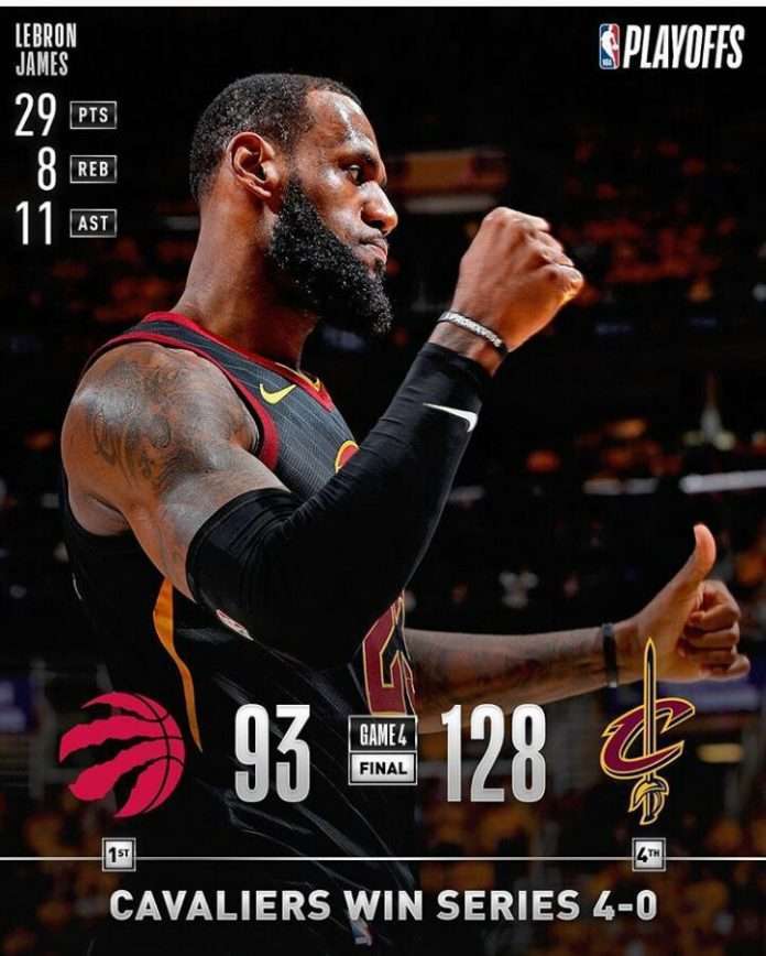 DeRozan fue enviado a una ducha temprana. Poco importó ya que Cleveland se llevó la victoria por 129-93 y se aseguró un lugar en la final de la Conferencia Este. Los compañeros de equipo de James fueron excepcionales en el cuarto juego después de haber sido ridiculizados en una sátira de Saturday Night Live esta semana sobre cómo son pasajeros en la búsqueda de la grandeza del rey.