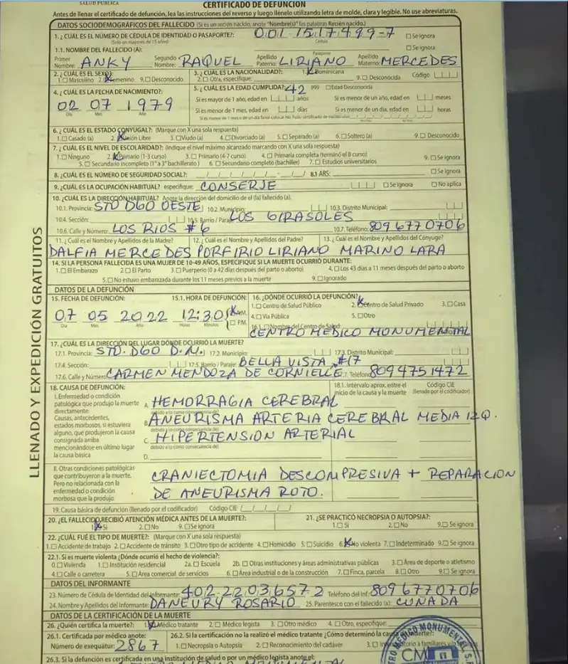 Se trata de Anky Raquel Liriano Mercedes quien falleció de un derrame cerebral, luego de estar varios días ingresada en la clínica referida.