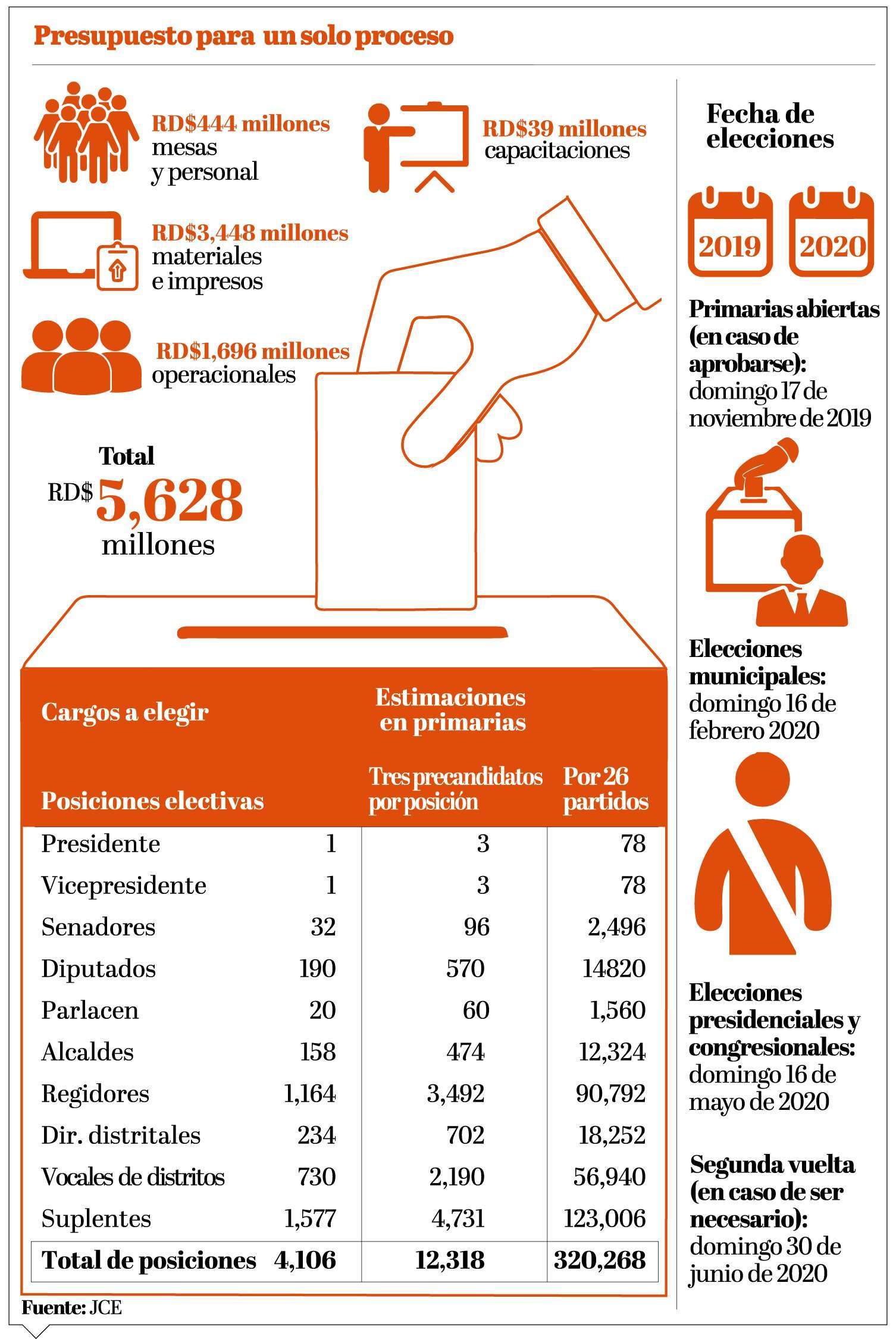 Un cálculo elaborado por los técnicos de la Junta Central Electoral, tomando en cuenta presupuestos electorales anteriores, la inflación acumulada y el crecimiento de la población votante, indica que un primer proceso costaría 320 mil candidatos