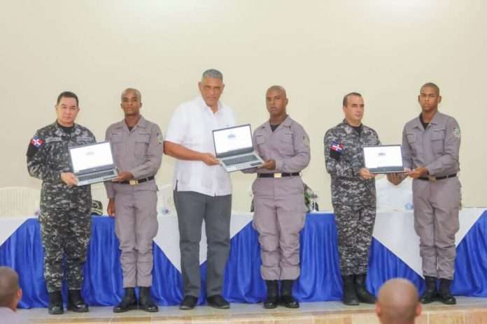 Durante el acto los conscriptos Stailyn Samuel Alcántara Sánchez, Neify Veras Novas y Francis del Carmen Florentino recibieron computadoras de manera simbólica en representación de sus compañeros de aulas, que entregaron Vásquez Martínez, el director general de la Policía Nacional, mayor general Eduardo Alberto Then y del rector del Instituto Policial de Educación Superior (IPES), general Juan Hilario Guzmán.