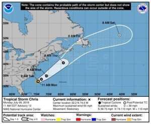 Chris, tercera tormenta con nombre en el Atlántico este año, se encuentra a 200 millas (325 kilómetros) al sursureste del Cabo de Hatteras, en Carolina del Norte, y presenta vientos máximos sostenidos de 70 millas por hora (110 km/h.).