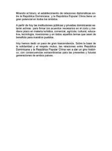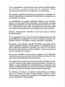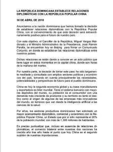 En el documento que leyó, dijo “que en estos momentos, el canciller dominicano, Miguel Vargas, y el ministro Administrativo de la Presidencia, José Ramón Peralta, se encuentran en Beijing para firmar un comunicado conjunto, en donde se establecen relaciones diplomáticas entre ambos gobiernos”.