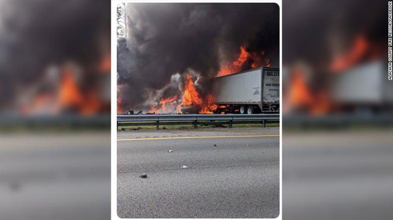 La Patrulla de Caminos de Florida dijo que dos camiones de carga y dos vehículos de pasajeros chocaron en la interestatal 75, a kilómetro y medio (una milla) al sur de Alachua, cerca de Gainesville. Las autoridades dijeron que el incendio comenzó después que unos 190 litros (50 galones) de diésel se derramaron sobre la autopista.