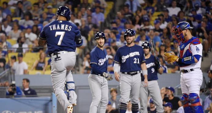 LOS ÁNGELES. Eric Thames disparó un vuelacercas de tres carreras, Christian Yelich amplió su racha de bateo a 14 juegos y los Cerveceros de Milwaukee superaron un breve apagón el lunes para imponerse por 5-2 a los Dodgers de Los Ángeles.